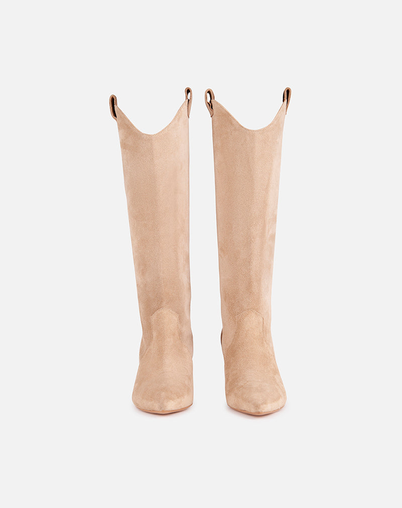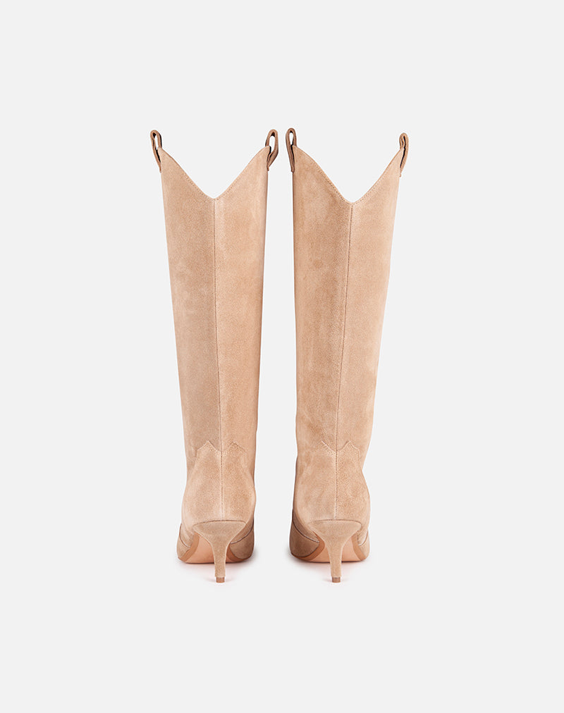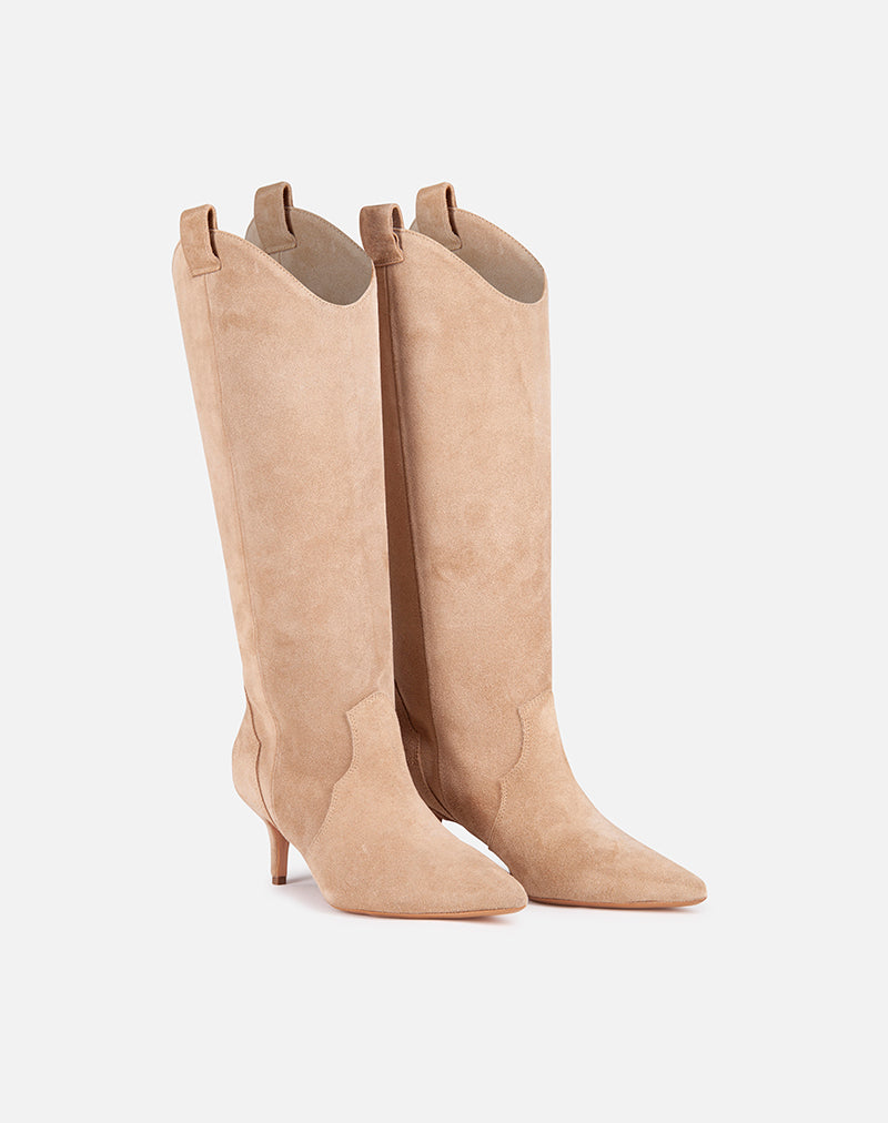 Stivale con gambale alto a tubo, realizzato in camoscio. Modello a punta. Tiretti laterali. Tacco sottile.